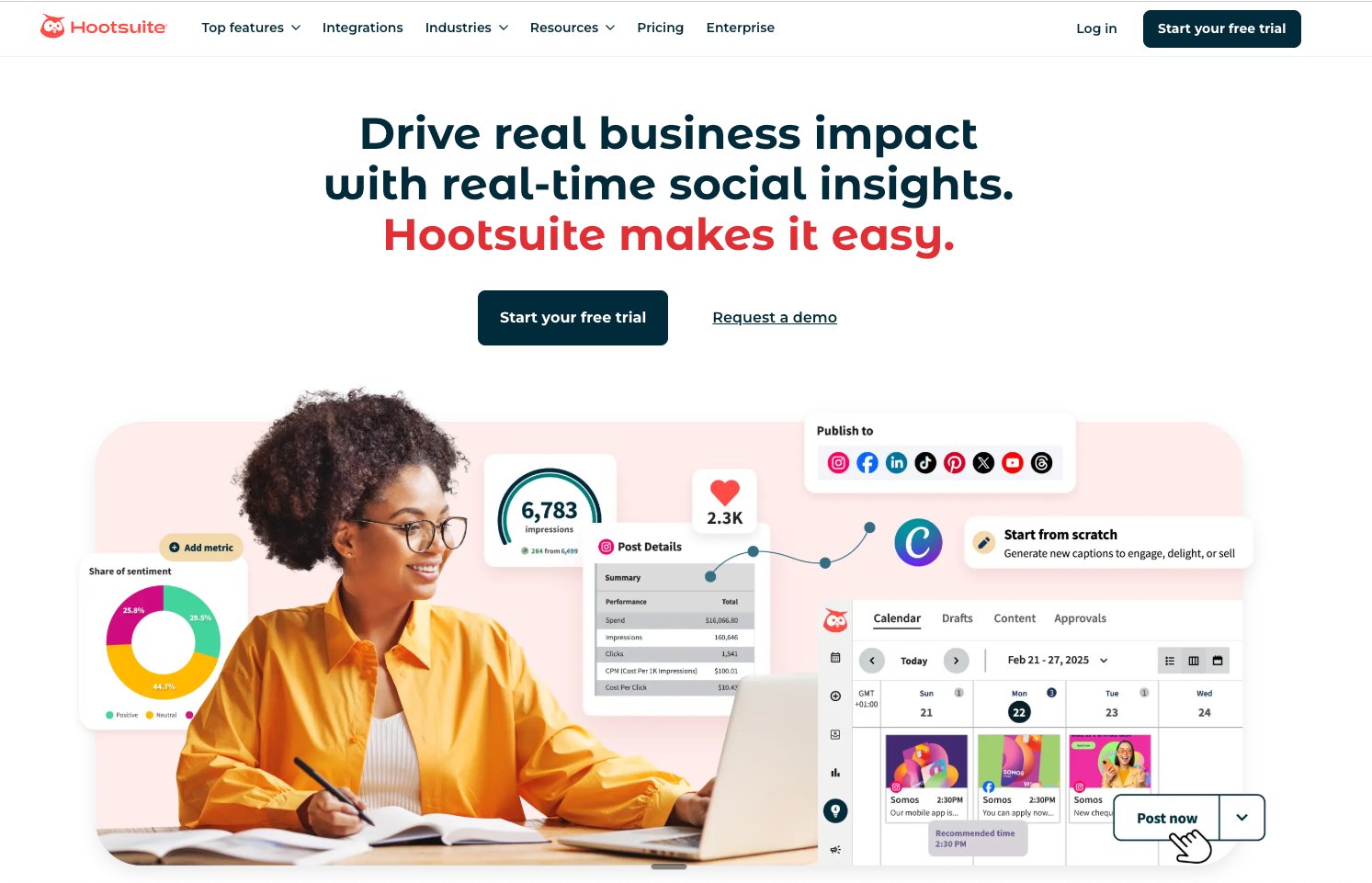 Pros & Cons: Hootsuite connects with over 20 social networks, making it incredibly versatile. However, the interface can feel cluttered for new users, and price hikes have made it less attractive for bootstrapped startups.